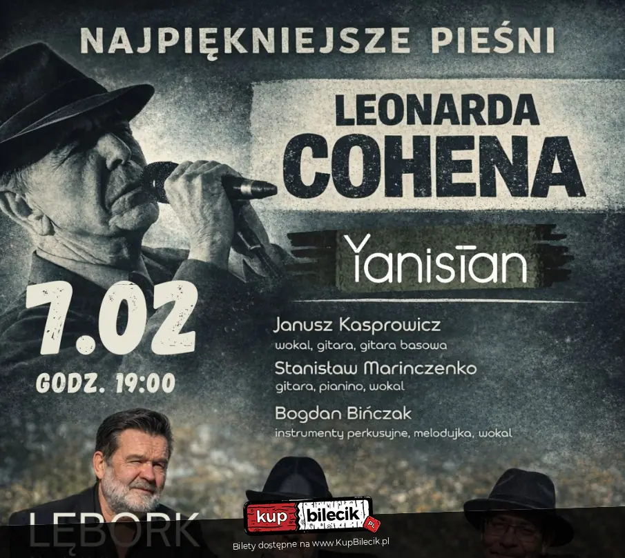 Artyści przygotowali program, który zachwyca nie tylko pięknymi gitarowymi aranżacjami czy delikatnym brzmieniem fortepianu ale również nastrojowymi chórkami, nadającymi utworom Cohena klasyczną, oryginalną głębię. Najpiękniejsze piosenki w języku polskim - m. in. "Alleluja", "Dance Me to the End of Love", "In my secret life", "I'm Your Man". Profesjonalne wykonanie - wieloletnie doświadczenie muzyków, starannie przygotowany repertuar i wysokiej klasy brzmienie. Podczas koncertu wystąpią wrocławscy muzycy tworzący zespół Yanistan - uznani pieśniarze w skład którego wchodzą: