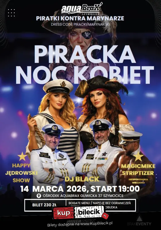Zapraszamy serdecznie na Piracką Noc Kobiet "Piratki kontra Marynarze", który poprowadzą Happy Jędrowski Show oraz DJ Black! w Obiekcie Eventowym Aquabrax
