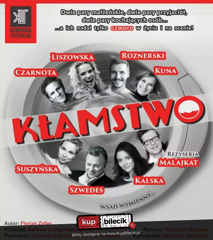 Niesamowite i przenikliwe, a przy tym, o zgrozo, zabawne studium, właśnie... Kłamstwa. Florian Zeller, francuski dramaturg zdążył już przyzwyczaić swoich widzów do ostrej jazdy i bolesnego telemarku, porusza się z gracją baletnicy i precyzją chirurga w meandrach i zakamarkach ludzkich umysłów. Dwie pary małżeńskie, dwie pary przyjaciół, dwie pary kochanków, a ich nadal tylko czworo, jak to jest możliwe? Wszystkiego dowiecie się Państwo podczas spektaklu "Kłamstwo"!