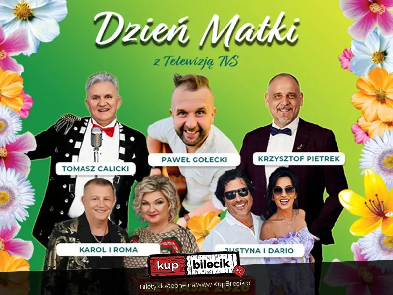 Zapraszamy na wyjątkowe wydarzenie muzyczne - Dzień Matki z Telewizją TVS! Szykuje się wieczór pełen dobrej energii, świetnej muzyki i pozytywnych emocji. Na scenie pojawią się artyści znani z anteny TVS, którzy od lat królują w sercach widzów i słuchaczy. Wystąpią: Paweł Gołecki, Tomasz Calicki, Justyna i Dario, Karol i Roma, Krzysztof Pietrek.