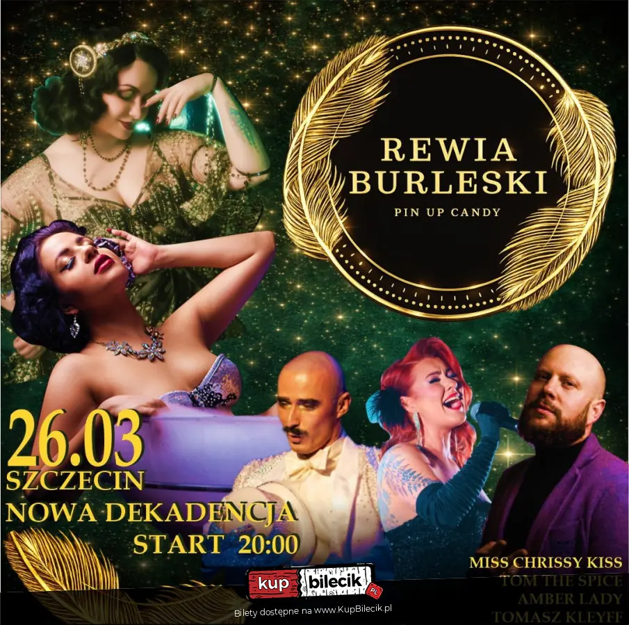 Zapraszamy na wyjątkowy wieczór pełen zmysłowej elegancji, blasku retro i wyrafinowanej rozrywki. Rewia Burleski by Pin Up Candy to spektakl inspirowany złotą erą kabaretu i glamouru, gdzie klasyczna burleska spotyka się z nowoczesną sceną i magnetyzującą charyzmą artystów. Na scenie wystąpi Pin Up Candy - ikona polskiej burleski i królowa stylu pin-up, która zabierze Was w hipnotyzującą podróż przez świat kokieterii, teatru i kuszącej elegancji. Towarzyszyć jej będzie Tom the Spice, który doda wieczorowi pikanterii i niespotykanej energii scenicznej. O muzyczną atmosferę zadba Amber Lady - wokalistka o uwodzicielskim głosie, idealnie wpisującym się w klimat dekadenckiego kabaretu.