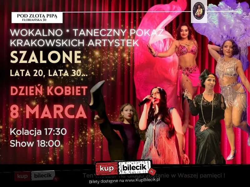 Kolację rozpoczynamy o 17:30, a spektakl o 18:00. "Szalone lata 20. lata 30." to elegancki spektakl wokalno-taneczny w wykonaniu artystek krakowskich, inspirowany atmosferą kabaretów i rewii międzywojnia. Lata 20. i 30. były w Polsce czasem niezwykle barwnym - pełnym muzyki, tańca i radości życia.