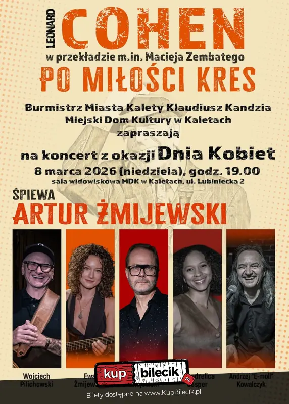 Artur Żmijewski, jeden z najbardziej znanych i cenionych polskich aktorów, tym razem zaskakuje w nowej roli prezentując program muzyczny z utworami Leonarda Cohena. Na koncertowej scenie usłyszymy takie utwory jak "Alleluja", "W tajnym życiu mym" (In My Secret Live), "Zuzanna", "Tańczmy po Miłości Kres" (Dance Me To The End of Love), "Wspomnienie" (Memories) oraz wiele innych. Każdy z nich, dzięki doskonałym tłumaczeniom autorstwa Macieja Zembatego, Romana Kołakowskiego i Michała Kuźmińskiego, zyskuje nowe życie, wprowadzając słuchaczy w świat pełen poezji, emocji i głębokiej refleksji.