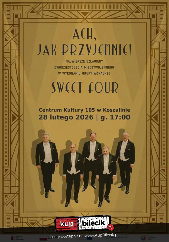 O wykonawcach: Kwartet Wokalny Sweet Four (Słodka Czwórka) to zespół śpiewający a cappella oraz z towarzyszeniem fortepianu, założony w 1991 roku. Pomysłodawcą i kierownikiem artystycznym zespołu jest Krzysztof Machowski, solista Warszawskiej Opery Kameralnej (obecnie Polskiej Opery Królewskiej). Zespół od lat kultywuje tradycje śpiewacze okresu międzywojennego i powojennego XX wieku, kontynuując dorobek dawnych rewelersów, takich jak Chór Dana, Juranda, Czejanda czy Comedian Harmonists. Sweet Four koncertował w kraju i za granicą, zdobywając uznanie miłośników klasycznej polskiej piosenki. Serdecznie zapraszamy na jubileuszowy wieczór pełen muzyki, wspomnień i elegancji!