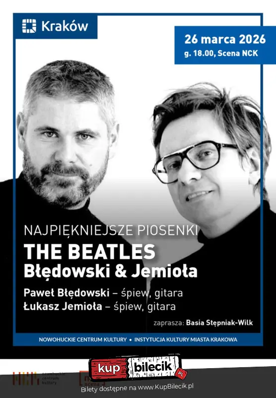Błędowski & Jemioła (Paweł Błędowski i Łukasz Jemioła) - dwaj autorzy piosenek, którzy postanowili połączyć siły we wspólnym muzycznym projekcie. Pod szyldem "The Beatles Akustycznie" wykonują piosenki "Czwórki z Liverpoolu", której fanami są od dziecka. Pod koniec 2025 roku, nakładem Agencji Muzycznej Polskiego Radia i Radia Lublin, ukazał się także ich autorski album "Błędowski & Jemioła", który - jak sami twierdzą - zawiera "dwa głosy, dwie gitary oraz szczery i prosty przekaz". "The Beatles Akustycznie" to nie tylko koncert, ale także muzyczna podróż, która przypomni o uniwersalnym przesłaniu twórczości Beatlesów - miłości, radości i harmonii. Nastrojowe aranżacje, subtelne brzmienia akustyczne i kameralna atmosfera zapewnią niezapomniany wieczór. "The Beatles Akustycznie" to koncert, który łączy pokolenia i wprowadza w świat muzyki, która się nie starzeje.