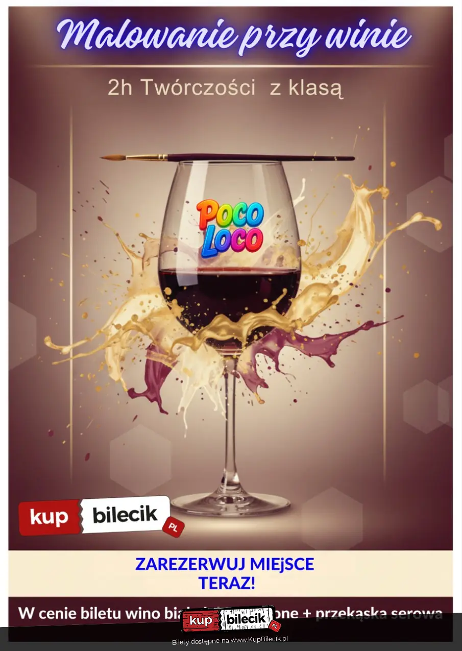 Cena obejmuje kompletny zestaw malarski (sztaluga, płótno, farby akrylowe, pędzle, fartuch), napoje (wino, woda) oraz drobne przekąski. Atrakcje dodatkowe: Edycja marcowa w Poco Loco jest rozszerzona o elementy taneczne i animacje (Ladies Day), co odróżnia ją od standardowych sesji malarskich.