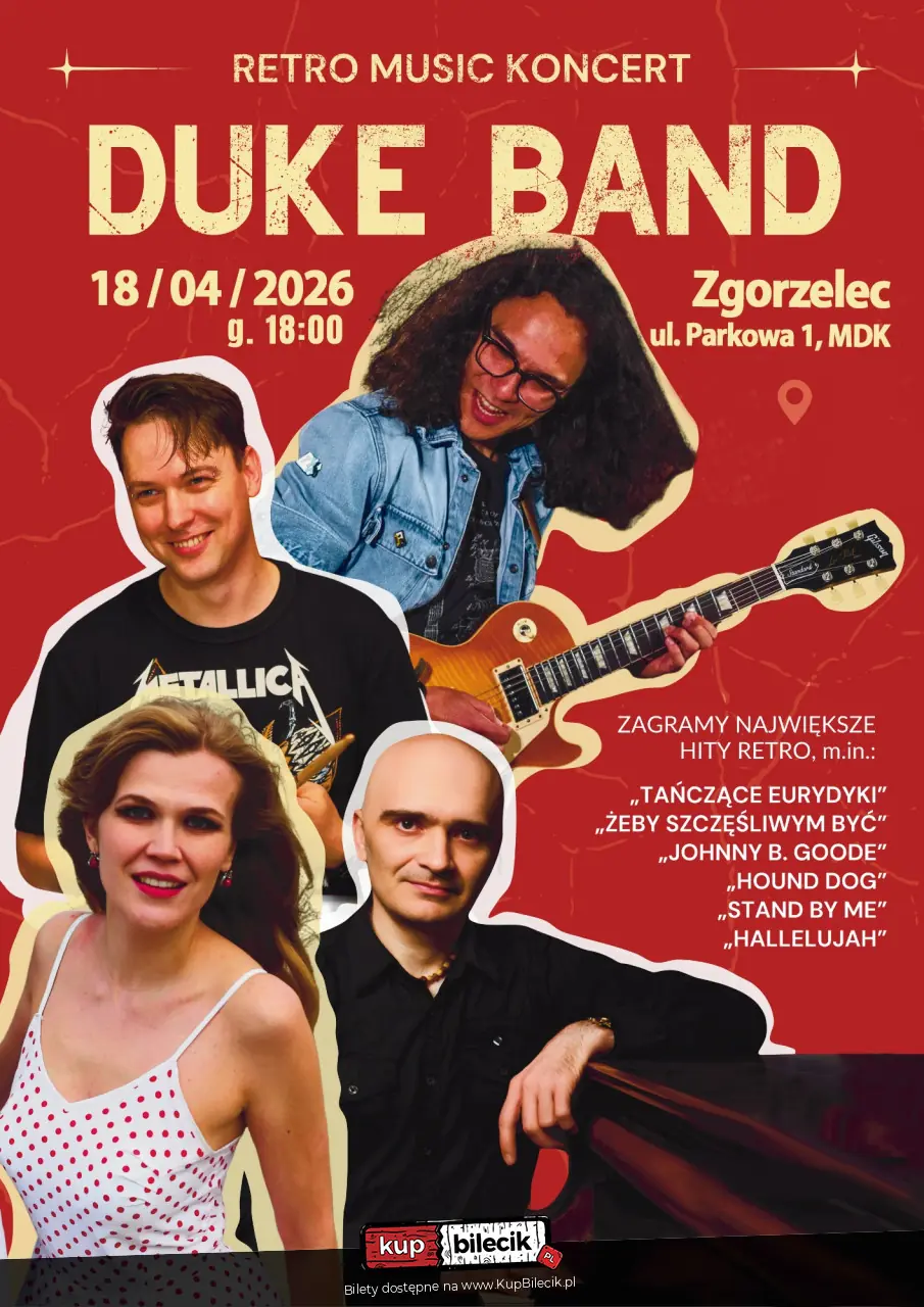 Zespół Duke zabierze w muzyczną podróż do czasów największych przebojów polskiej, włoskiej i amerykańskiej sceny. Duke Band - to muzyka, która porusza serca. Każda nuta niesie emocje, a każda piosenka opowiada swoją historię. Na scenie zabrzmią nastrojowe ballady, energetyczny rock'n'roll oraz światowe hity w zaskakujących aranżacjach - od "Tańczące Eurydyki" i "Żeby szczęśliwym być", przez "Johnny be Goode" i "Hound Dog", aż po "Stand by Me" i magiczne "Hallelujah", które na chwilę zatrzyma czas. Czeka Was wieczór pełen nostalgii, dobrego humoru i niezwykłej energii płynącej z muzyki na żywo.