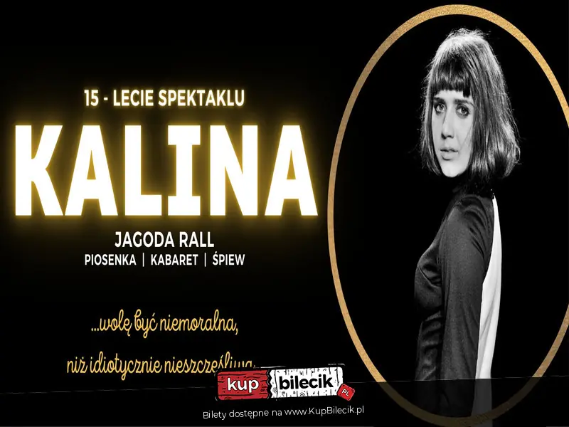 Z największą radością pragnę zaprosić Państwa na wspólne świętowanie 15-lecia monodramu pt. "KALINA" w reżyserii i wykonaniu cenionej aktorki teatralnej i telewizyjnej, i co ważne - Tarnowianki - Jagody Rall. To wzruszająca, błyskotliwa opowieść o Divie PRL'u ukazująca wszystkie kolory tytułowej Kaliny Jędrusik. Kalina uwodzi. Kalina rozśmiesza. Kalina porusza. Kalina jak żywa zaprosi Państwa do swojego świata, zaczaruje i otuli swoim głosem. W spektaklu usłyszą Państwo znane piosenki, które niegdyś przed laty wykonywała sama Kalina Jędrusik takie jak "Mój pierwszy bal", "Z kim tak Ci będzie źle jak ze mną" czy "Ciepła wdówka na zimę", a także anegdoty z życia Artystki. Będą Państwo nie tylko oglądać spektakl z pozycji Widza, ale zostaną Państwo wciągnięci do kalinowego świata, by stać się częścią tej historii. Kalina przekracza symboliczną czwartą ścianę i dosłownie wciąga Widza na scenę! PS. Bez obaw - do tej pory nikt nie ucierpiał!