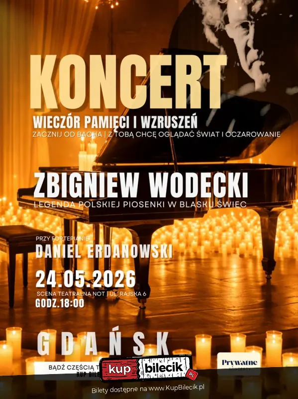 Pełen emocji, wspomnień i ponadczasowej muzyki. Światło świec stworzy intymną, poruszającą atmosferę, która pozwoli przeżywać muzykę głębiej, subtelniej i bardziej osobiście. Na scenie wybrzmi fortepian w mistrzowskim wykonaniu Daniela Erdanowskiego, którego niezwykły wokal, przywoła ducha i wrażliwość Zbigniewa Wodeckiego. To połączenie sprawi, że jego twórczość znów stanie się bliska, jak piękne wspomnienie, do którego chce się wracać.