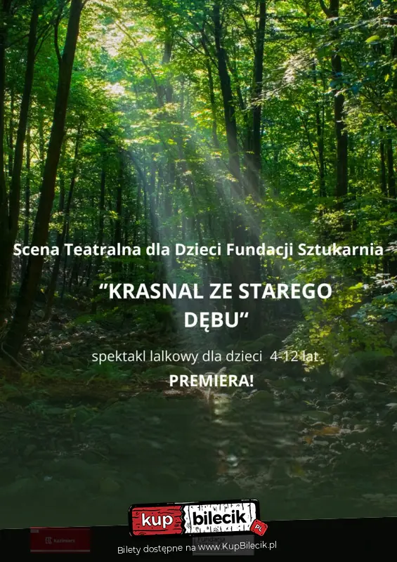 "Krasnal ze Starego Dębu" to magiczny spektakl lalkowy dla dzieci w wieku 4-12 lat Sceny Teatralnej Fundacji Sztukarnia. To pełna przygód i humoru opowieść o odwadze, przełamywaniu własnych lęków oraz odkrywaniu sensu w świecie pełnym wyzwań! W sercu starego lasu rośnie potężny, stary dąb, w którym mieszka Krasnal. Choć z pozoru nieśmiały, wyrusza w podróż, która odmieni nie tylko jego samego, ale i los całego leśnego świata! Na swojej drodze spotyka barwnych bohaterów: Panią Mysz, Kumaka, Wiewiórkę, Sójkę i Puchacza, który strzeże sekretów natury.