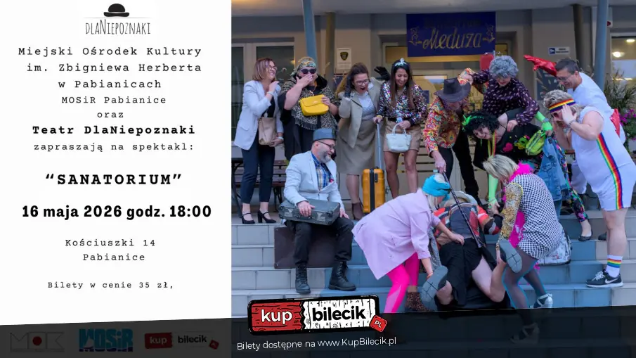 "Sanatorium" to spektakl Teatru DlaNiepoznaki, który działa przy Miejskim Ośrodku Kultury im. Zbigniewa Herberta w Pabianicach. Akcja zaczyna się w drodze do w/w Uzdrowiska MEDUZA - witaj przygodo! Kim jest tajemnicza osoba sprzątająca MEDUZĘ, co detektyw robi w sanatorium? A siostry bliźniaczki dlaczego krzątają się po ośrodku? Czy dyrektor Władek i trener Gładka Klatka odpowiednio wykonują swoje obowiązki?