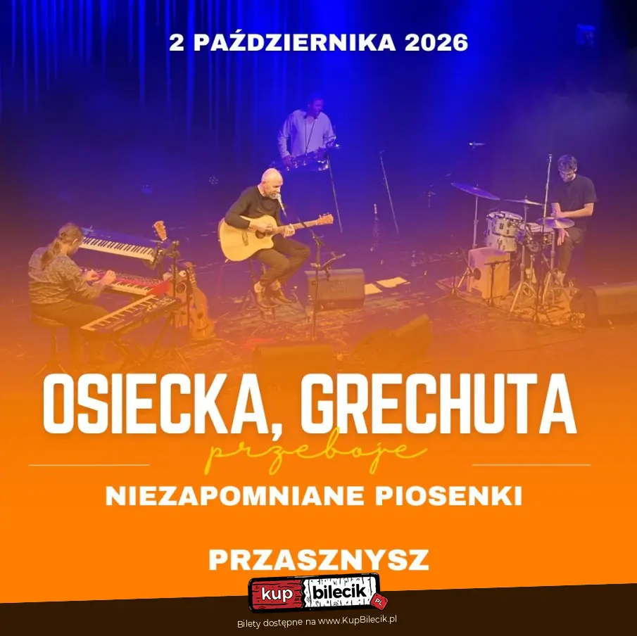 Zapraszamy na koncert poświęcony twórczości Agnieszki Osieckiej oraz Marka Grechuty. W programie znajdą się najwybitniejsze, najbardziej znane piosenki napisane przez Agnieszkę Osiecką: m.in. "Piosenka o okularnikach", "Niech żyje bal", "Kołysanka dla okruszka", "Kiedy mnie już nie będzie", "Co każdy chłopiec wiedzieć powinien oraz wybitne utwory wykonywane przez Marka Grechutę: "W dzikie wino zaplątani", "Niepewność", "Historia jednej podróży", "Korowód", "Świat w obłokach", "Dni których nie znamy" oraz wiele innych.