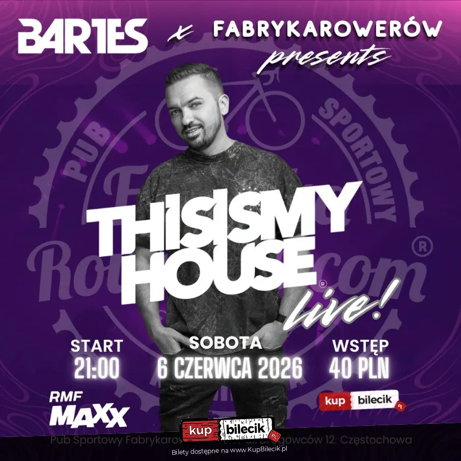 Znany z energetycznych setów, które podbijają festiwalowe sceny i najlepsze kluby na Ibizie, DJ Bartes zagości w Fabryce Rowerów! BARTES to artysta z ponad 20-letnim doświadczeniem, który doskonale wie, jak budować klimat. Jego styl to unikalne połączenie melodyjnego, progresywnego, wokalnego i afro house'u, czyli brzmień, które hipnotyzują, unoszą i nie pozwalają zejść z parkietu. Projekt This Is My House Live w połączeniu z industrialną przestrzenią Fabryki Rowerów, światłami, pulsującym basem i energią ludzi stworzy atmosferę, którą zapamiętasz na długo!