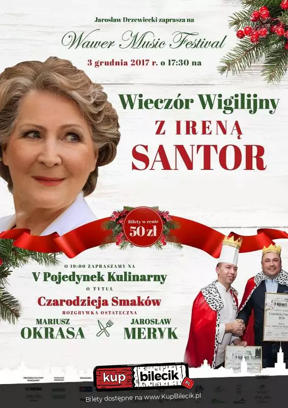 Wieczór Wigilijny z Ireną Santor to drugi koncert IX edycji Wawer Music Festival. Wielka dama polskiej piosenki, zachwycająca swoim mezzosopranowym głosem publiczność od ponad 50 lat. Niezmiennie pogodna, uśmiechnięta, z zaraźliwym optymizmem patrząca na świat. Irena Santor to żyjąca legenda polskiej muzyki rozrywkowej, laureatka wielu nagród, wyróżnień i odznaczeń. Swoją karierę zawodową rozpoczęła w 1951 roku w Państwowym Zespole Ludowym Pieśni i Tańca "Mazowsze", gdzie znalazła się z polecenia dyrektora Opery Poznańskiej Zdzisława Górzyńskiego. Po opuszczeniu "Mazowsza", w 1959 roku dokonała pierwszych nagrań i zadebiutowała jako solistka na estradzie. Kolejne lata jej kariery to nieprzerwane pasmo sukcesów, występów, nagrań radiowych, płytowych i telewizyjnych. Artystka stale występuje ze swoim recitalem. Podczas Wieczoru Wigilijnego o godzinie 19:00 odbędzie się V Pojedynek Kulinarny między Mariuszem Okrasą a Jarosławem Merykiem o tytuł Czarodzieja Smaków. Pojedynek Kulinarny już na stałe wpisał się w tradycję wigilijną Wawrowskiego Festiwalu, zawszę zapewniając gościom moc emocji w pogodnym i świątecznym duchu.