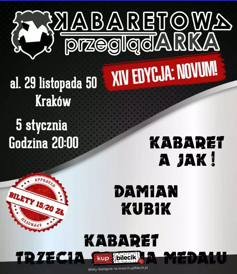 Szykujemy dla Was kolejną, już XIV edycję Kabaretowej PrzeglądARKI! Dziękujemy, że jesteście z nami tyle czasu i przez tyle edycji. Ta impreza odbywa się i rozwija tylko dzięki Wam! Dlatego specjalnie dla Was idziemy krok dalej. W XIV edycji obiecane wcześniej nowości! Nowa forma, nowy stały skład i nowe kabaretowe wrażenia dla Was! Wszystko to na dobre rozpoczęcie nowego roku! Specjalnie dla Was rozszerzamy stały skład każdej edycji, począwszy od tej, o kolejne dwa podmioty artystyczne. Znane już przeglądarkowiczom z gościnnych występów we wcześniejszych edycjach. W kolejnych edycjach szykujemy dla Was dodatkowo gości specjalnych. Ale o tym przy kolejnej okazji. W programie, oprócz gospodarzy czyli kabaretu z wyglądu i podejścia typowo męskiego, Stand-up + One Man Show oraz kabaret całkowicie, niepodważalnie i nieodwracalnie żeński! Czyli specjalnie dal Was pełna różnorodność humorystyczna i komediowa. A dokładniej:
