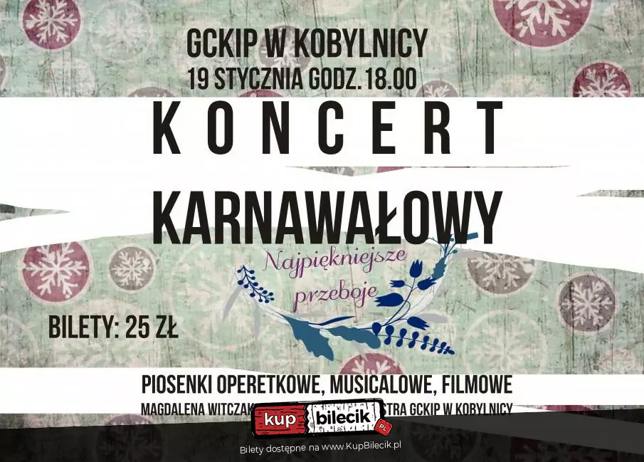 Najpiękniejsze arie operowe i operetkowe, znane i lubiane przeboje największych scen muzycznych. Taki repertuar obejmuje karnawałowy koncert, który odbędzie się 19 stycznia w Gminnym Centrum Kultury i Promocji w Kobylnicy. W czarowną atmosferę karnawałowej piosenki wprowadzą nas Magdalena Witczak, Piotr Macalak oraz Orkiestra Gminnego Centrum Kultury i Promocji w Kobylnicy. Publiczność usłyszy najpiękniejsze piosenki operetkowe, musicalowe i filmowe. Początek koncertu o godzinie 18.00.