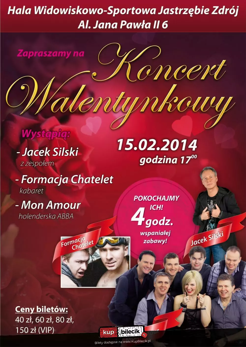 Zapraszamy Państwa na 4 godziny wspaniałej zabawy podczas Koncertu Walentynkowego. Wystąpi dla Państwa holenderski zespół Mon Amour oraz Jacek Silski z zespołem. Ponadto, nie zabraknie dawki humoru i dowcipu, co zapewni nam Formacja Chatelet.