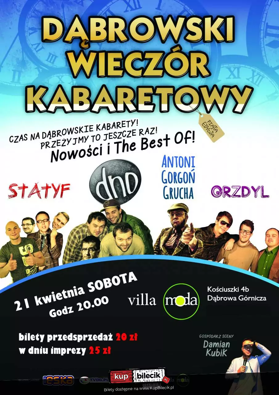 Jedyny i niepowtarzalny wieczór. Tylko na ten występ reaktywują się 2 kabarety z Dąbrowy. Po 10 latach Statyf i Grzdyl. Do tego dorzucamy kabaret Dno i Antoniego Gorgonia Gruchę w programach The Best Of i nowych numerach. I już nie trzeba bardziej zapraszać. Do zobaczenia! :)