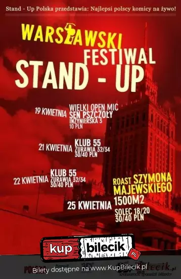 Warszawski Festiwal Stand-up\'u odbędzie się w dniach 19-25 kwietnia. Zapraszamy na niego najlepszych aktywnych komików parających się stand-up comedy w Polsce. Do konkursu wybrane zostanie 10 osób. Każdy dostanie na scenie 5 minut, a publiczność wybierze zwycięzcę, który w nagrodę wystąpi na drugim dniu Warszawskiego Festiwalu Stand-up\'u (22 kwietnia).
