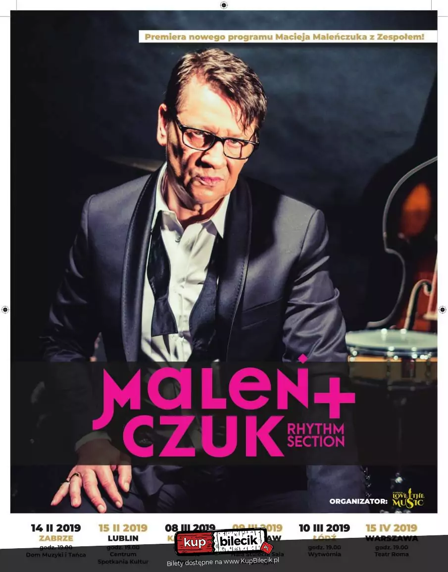 MALEŃCZUK + rhythm section to recital, który jest retrospekcją dotychczasowych dokonań Artysty uzupełniony sekcją rytmiczną. Składa się z zestawu pieśni zarówno ulicznych jak i późniejszych dokonań Maćka, które zyskały mu olbrzymią sympatię i popularność wśród wyrobionej części publiczności. Bliski bezpośredni kontakt z widownią, szczery, niezakłócony przekaz tekstu, no po prostu Maleńczuk w czystej postaci. TEN, o którym się mówi nie do podrobienia, naturalny, dowcipny, czasem brutalny - bo takie jest życie! Nie zabraknie więc pieśni: Ostatnia Nocka, Tango Libido, Sługi za szlugi, Synu czy Dawna Dziewczyno. Słynny już MALEŃCZUK "KONCERT SOLO" z kolegami z sekcji rytmicznej to najnowsza wersja Show, aby urozmaicić i podzielić się przestrzenią na scenie. Do tego oryginalny styl gry na gitarze i nieskażona niczym Wolność Słowa.