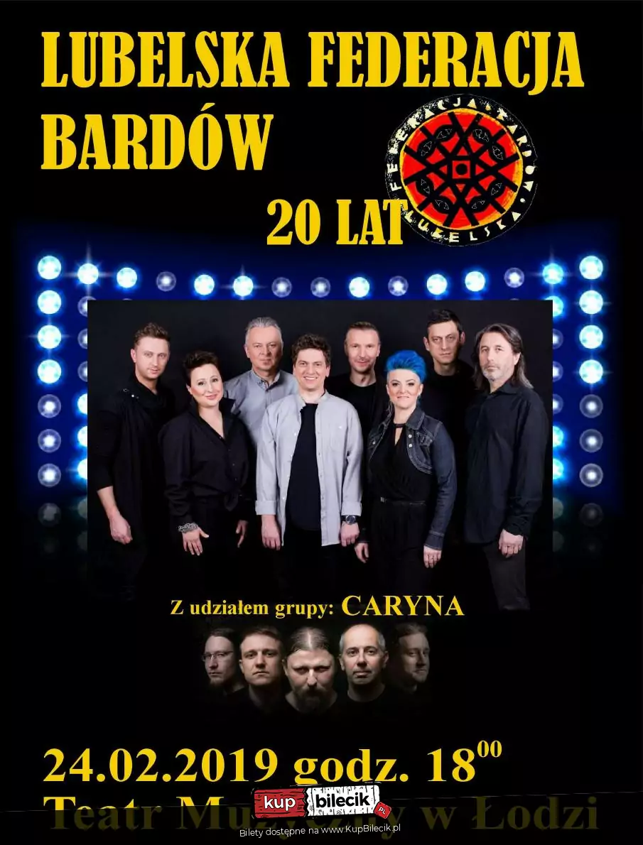 Zapraszamy Państwa na wspaniały koncert z okazji XX lecia Lubelskiej Federacji Bardów. LFB to zespół niezwykły, składający się z samych wielkich osobowości scenicznych. Każdy z członków zespołu prowadzi z powodzeniem własną działalność artystyczną....a czasami spotykają się na wspólnych koncertach, które na zawsze zapadają w pamięć oczarowanej publiczności przenosząc ją w zaczarowany świat Krainy Łagodności. Na scenie pojawią się także przyjaciele LFB grupa Caryna doskonale znana miłośnikom klimatu w całej Polsce.