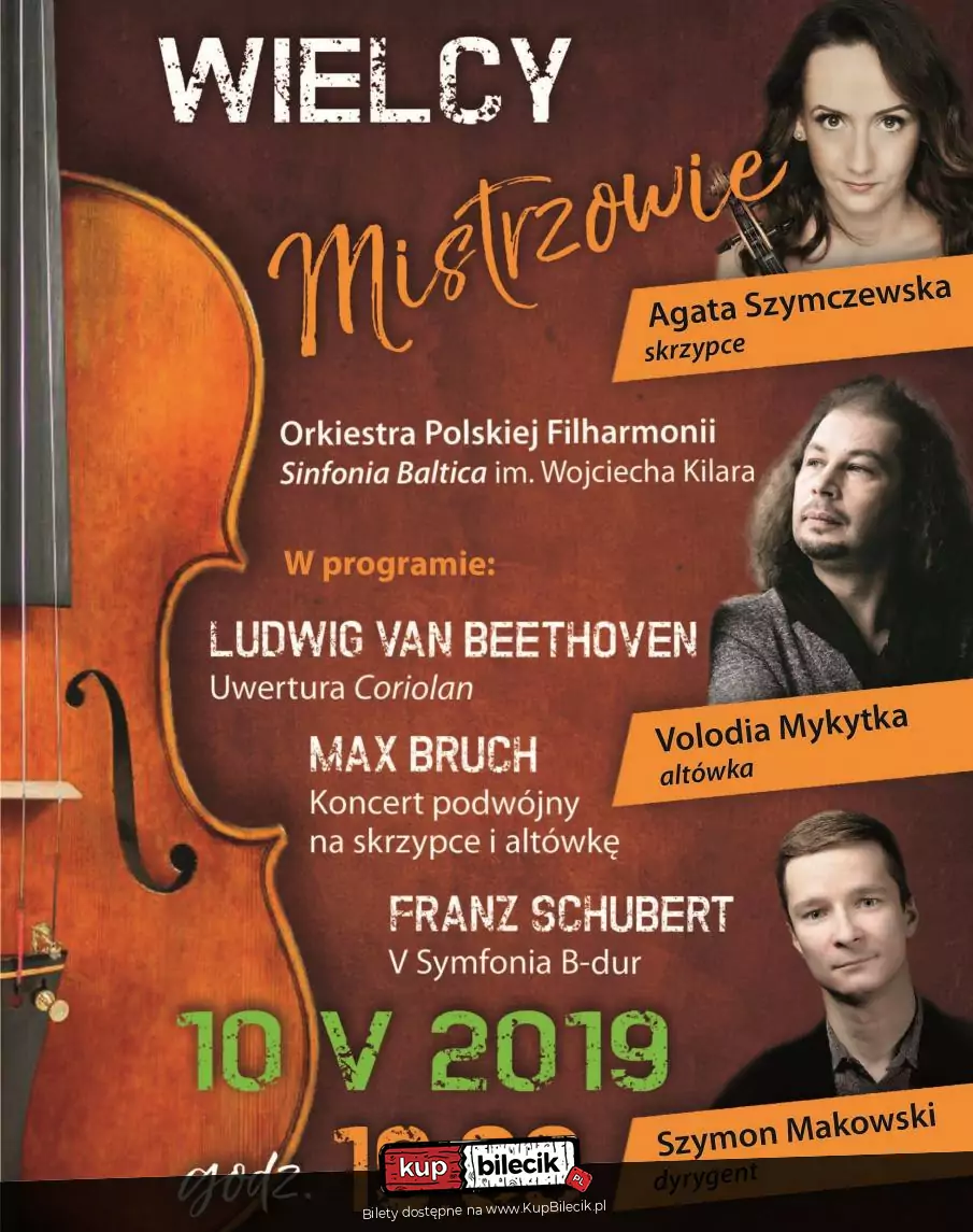 W maju zapraszamy na wieczór muzyki Wielkich Mistrzów w mistrzowskim wykonaniu! Na początku usłyszymy znakomitą uwerturę Coriolan Ludwika van Beethovena, która jest tragiczną opowieścią o tytułowym rzymskim generale Coriolanie. Następnie będziemy mieli okazję posłuchać koncertu na skrzypce i altówkę Maxa Brucha w wykonaniu wybitnych solistów: Agaty Szymczewskiej (skrzypce), laureatki m.in. Międzynarodowego Konkursu im. H. Wieniawskiego i Volodii Mykytka (altówka), laureatowi takich międzynarodowych konkursów jak Premio Vittorio Gui we Florencji, czy Melbourne International Chamber Music Competitions. Całość zwieńczy V symfonia Franza Schuberta. Orkiestrę Sinfonia Baltica poprowadzi Szymon Makowski, na co dzień pierwszy dyrygent Filharmonii Dolnośląskiej.