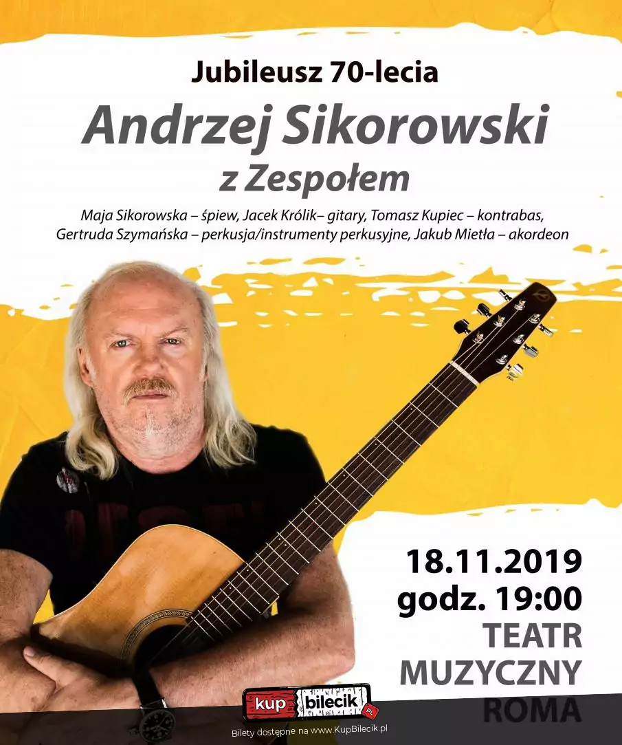 Rok 2019 jest szczególny w biografii tego Artysty. W październiku będzie obchodził piękny jubileusz siedemdziesiątych urodzin. Kolejny jubileuszowy akcent, to 50 lat pracy artystycznej, a od ponad 40 lat jest na scenie z grupą "Pod Budą". 40 lat temu otrzymał wyróżnienie na festiwalu Polskiej Piosenki w Opolu, a 30 lat temu na Sopot Festival '89. Nagrywał płyty z grupą "Pod Budą" oraz solowe, ale także z córką Mają Sikorowską, czy też z Grzegorzem Turnauem. Z udziałem kilkuosobowego zespołu muzycznego, w tym córki Mai, ANDRZEJ SIKOROWSKI wykona swoje największe przeboje, w tym z repertuary grupy "Pod Budą". To będzie absolutnie zachwycający koncert! !