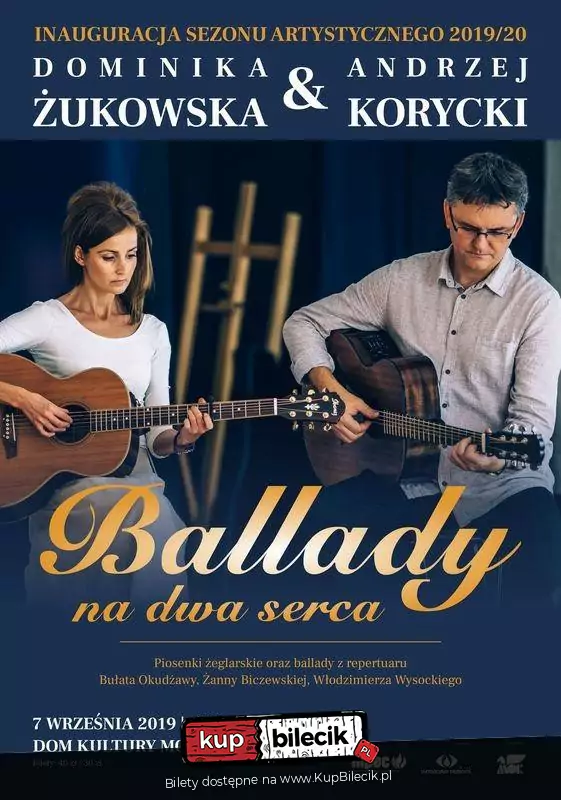 Artystyczny sezon 2019/20 w Miejskim Ośrodku Kultury zainauguruje 7 września koncert Andrzeja Koryckiego i Dominiki Żukowskiej. W programie zatytułowanym "Ballady na dwa serca" usłyszymy piosenki żeglarskie oraz ballady z repertuaru Bułata Okudżawy, Włodzimierza Wysockiego i Żanny Biczewskiej.