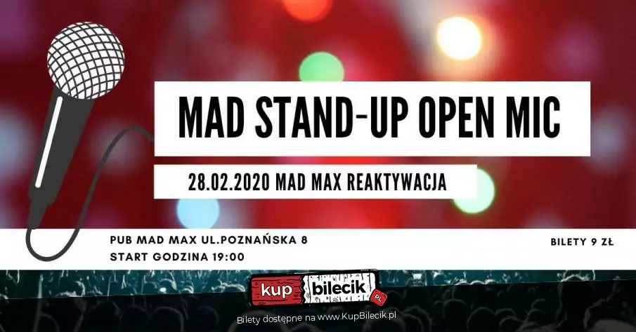 Po dłuższej przerwie, pełni energii i nowych pomysłów wracamy z otwartym mikrofonem do Mad Max'a! Ubiegłe wydarzenia udowodniły, że jest to idealne miejsce aby spróbować swoich sił na scenie. Marzysz o karierze komika? Zgłoś się! Oglądając stand-up masz poczucie, że jesteś w stanie robić to lepiej? Spróbuj! Jesteś samotnym nieudacznikiem życiowym? Weź się do roboty!
