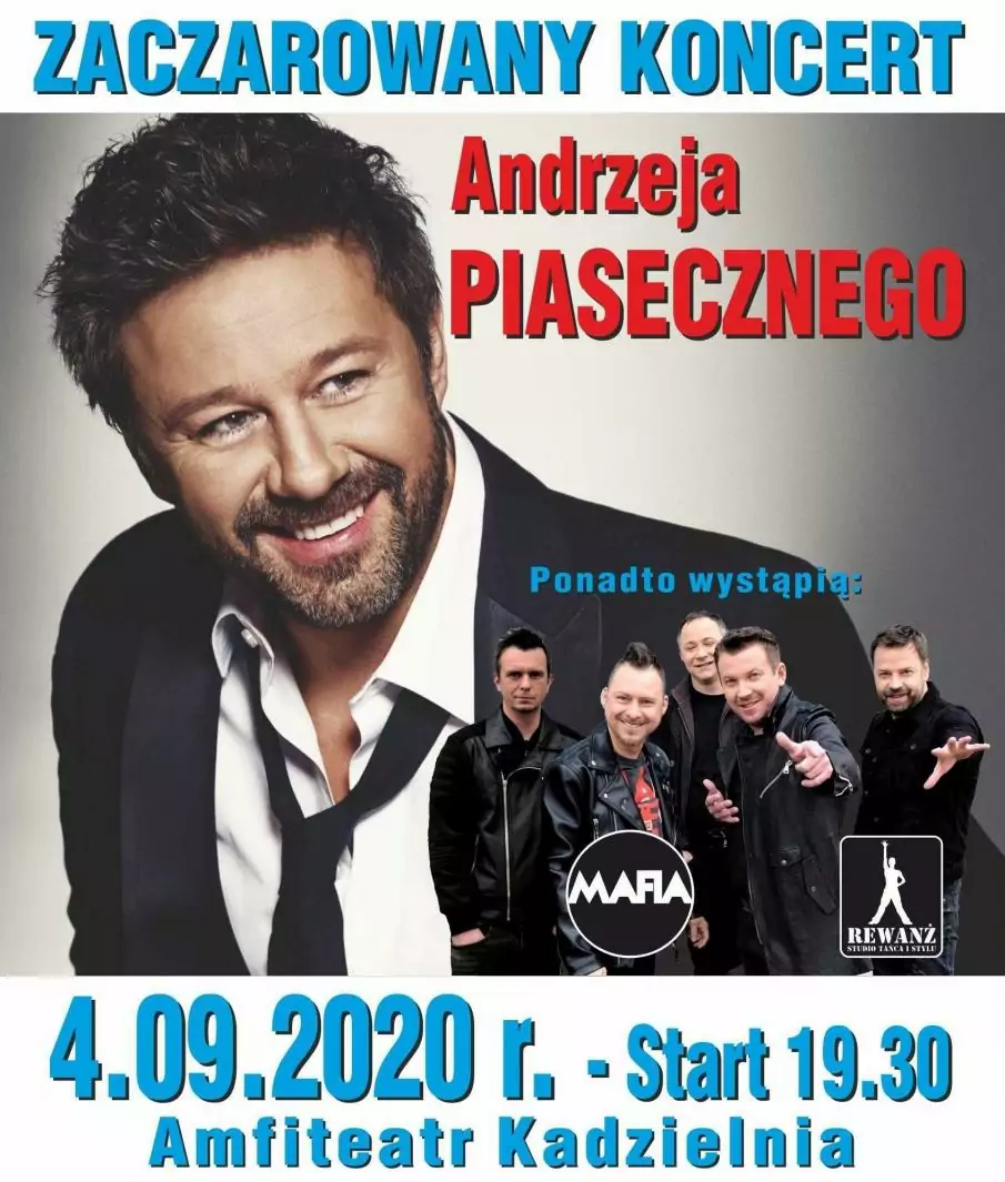 ZACZAROWANY KONCERT ANDRZEJA PIASECZNEGO !!! Najpopularniejszy polski wokalista. Budzi powszechny szacunek i zachwyt. Na scenie po prostu… czaruje !Wystąpi tez zespół MAFIA z którym Andrzej Piaseczny zaczynał przed wieloma laty piosenkarską karierę