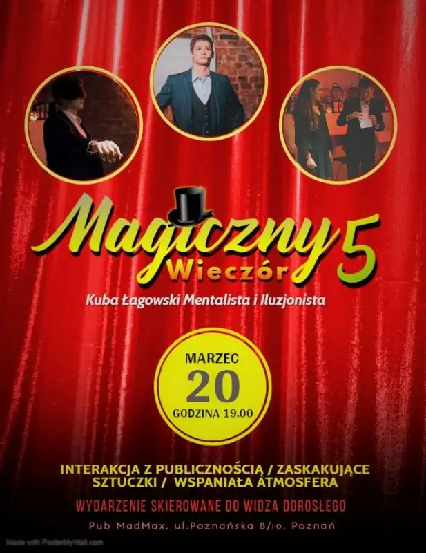Jakub Łagowski - iluzjonista i mentalista będzie zabawiał was cały wieczór, a salwom śmiechu nie będzie końca. Wszystko w klimatycznym, kameralnym pubie Mad Max przy ulicy Poznańskiej 8 na Jeżycach.