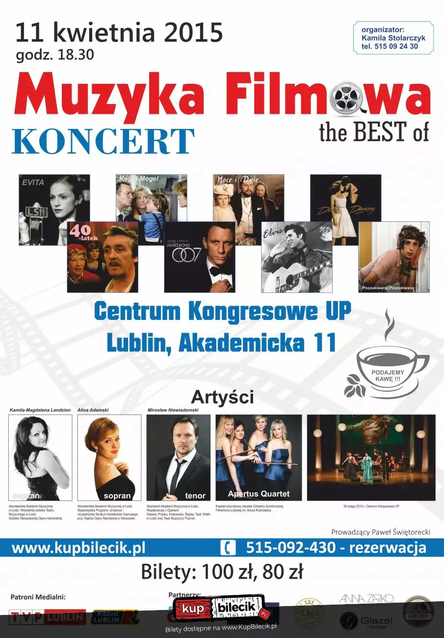 Na jednej scenie znajdą się znani śpiewacy i muzycy. Koncert ten powinien szczególnie zainteresować miłośników muzyki filmowej głównie dlatego,iż nie brak będzie prawdziwych kinowych hitów. Usłyszymy utwory z takich filmów jak; walc "Noce i dnie", James Bond Skyfall, Poszukiwany... poszukiwana... Kogel-Mogel " Szukaj mnie...", Evita "Don\'t cry for me Argentina.." i wiele innych znanych scieżek filmowych. W roli solistów wystąpią utytułowani śpiewacy scen Polskich - Kamila Magdalena Lendzion(sopran) Absolwentka Akademii Muzycznej w Łodzi, solistka Warszawskiej Opery Kameralnej,wieloletnia solistka Teatru Muzycznego w Łodzi oraz uczestniczka Europejskiego Festiwalu im. Jana Kiepury w Krynicy Zdroju na specjalnie zaproszenie Bogusława Kaczyńskiego. Alina Adamski(sopran) ? Absolwentka Akademii Muzycznej w Łodzi, stypendystka programu Erasmus,uczestniczka kursu kształcenia operowego przy Teatrze Opery Narodowej w Warszawie. Mirosław Niewiadomski(tenor) - Absolwent Akademii Muzycznej w Łodzi współpracuje z teatrami operowymi w kraju i za granicą : Operą Narodową w Warszawie, Operą Śląską, Odeską, Praską, Teatrem Wielkim w Łodzi. Towarzyszyć im będzie "Apertus Quartet" kameralny zespół filharmoników Łódzkich. Prowadzenie Koncertu Pan Paweł Świętorecki. Podczas koncertu podajemy kawę. Poprzedni Koncert ze Wspólnego projektu pt. "Wieczór Wiedeński" który odbył się również w Centrum Kongresowym UP 26 lutego 2015 był niezwykle udany sądząc po ilości braw otrzymanych od Wspaniałej Publiczności..
