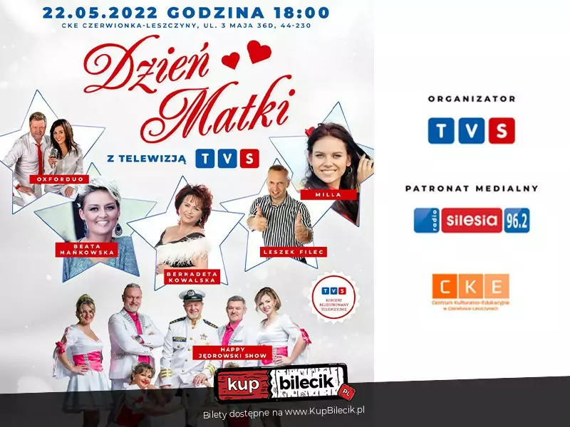 Już 22 maja o godz. 18:00 Telewizja TVS serdecznie zaprasza wszystkich, a w szczególności Mamy, na obchody ich pięknego święta w Centrum Kulturalno-Edukacyjnym w Czerwionce-Leszczynach. Chwytających za serce emocji dostarczą Państwu: Zespół Happy Jędrowski Show, zespół Oxforduo, Beata Mańkowska, Leszek Filec, Milla oraz Bernadeta Kowalska.