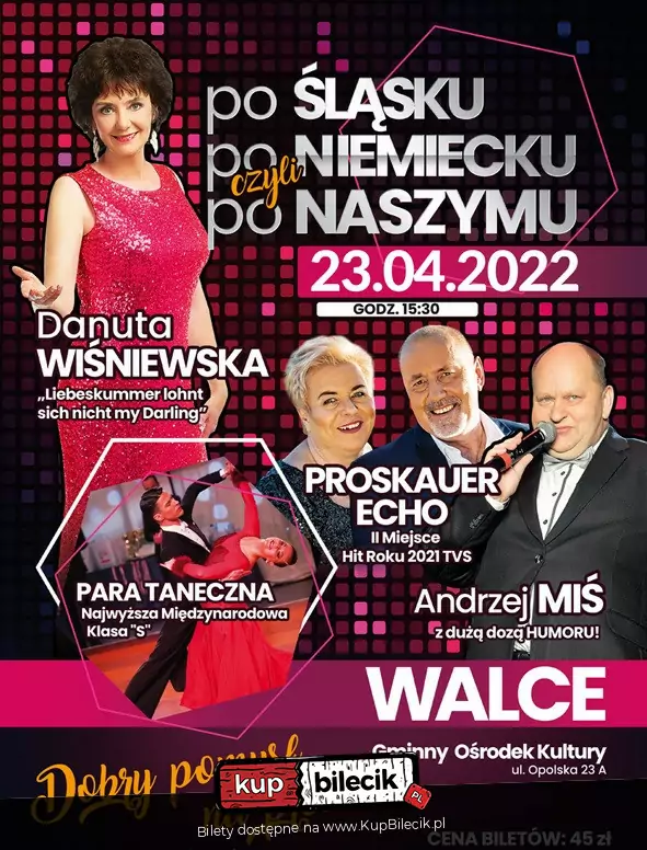 "Po śląsku, po niemiecku, czyli po naszymu" to barwny, niepowtarzalny koncert przepełniony pięknymi strojami, najbardziej lubianą przez Publiczność śląską i niemiecką muzyką szlagierową, prezentowaną przez dobrze znanych naszej Publiczności Wykonawców: Danutę Wiśniewską oraz Duet "Proskauer Echo"! Całość swoimi wybornymi przerywnikami niesamowitego tańca Mistrzów Świata klasy S udoskonali - Konstantin Art. School! Koncert poprowadzi dobrze znany Państwu Prezenter Radiowy z genialnym poczuciem humoru: Andrzej Miś! Cały program to wyśmienita zabawa. wspólny śpiew, niespodzianki dla naszej wyczekiwanej Publiczności... i DUŻA PORCJA HUMORU!