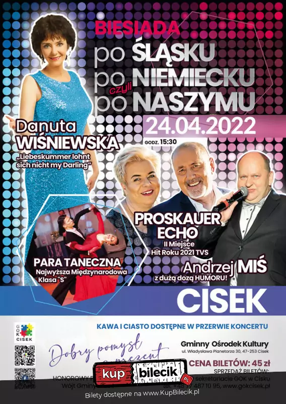"Po śląsku, po niemiecku, czyli po naszymu" to barwny, niepowtarzalny koncert przepełniony pięknymi strojami, najbardziej lubianą przez Publiczność śląską i niemiecką muzyką szlagierową, prezentowaną przez dobrze znanych naszej Publiczności Wykonawców: Danutę Wiśniewską oraz Duet "Proskauer Echo"! Całość swoimi wybornymi przerywnikami niesamowitego tańca Mistrzów Świata klasy S udoskonali - Konstantin Art. School! Koncert poprowadzi dobrze znany Państwu Prezenter Radiowy z genialnym poczuciem humoru: Andrzej Miś! Cały program to wyśmienita zabawa. wspólny śpiew, niespodzianki dla naszej wyczekiwanej Publiczności... i DUŻA PORCJA HUMORU!