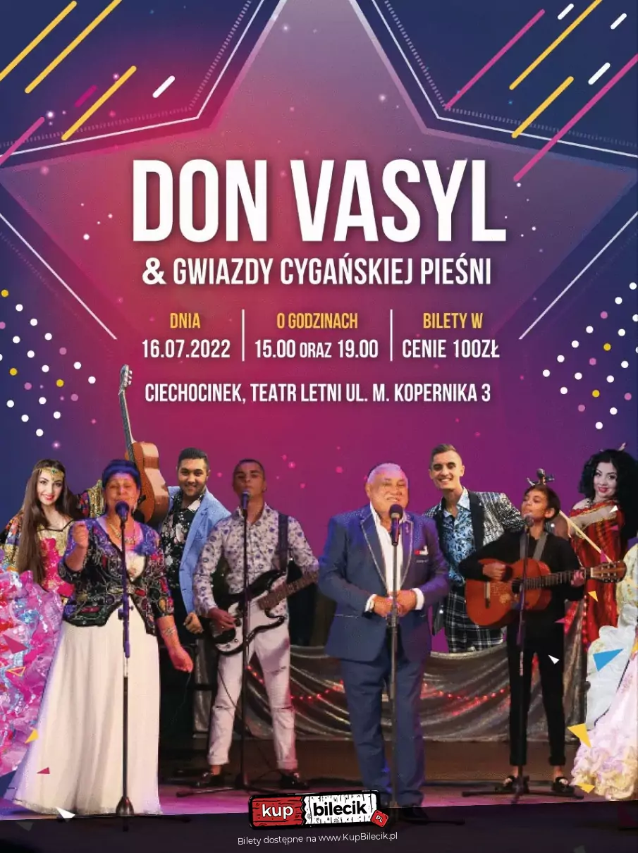 Już 16 lipca o godzinie 15:00 w teatrze letnim w Ciechocinku, odbędzie się wielkie Cygańskie muzyczne widowisko. Zagrają Don Vasyl i Gwiazdy Cygańskiej Pieśni i Tańca, pierwsza Dama muzyki cygańskiej Elza, Cygańscy Książęta: Oskar, Princ, Giovanni i Dżulian oraz Gwiazdy Cygańskiej pieśni z Ukrainy Albina Koval, Kristina i Ramir.