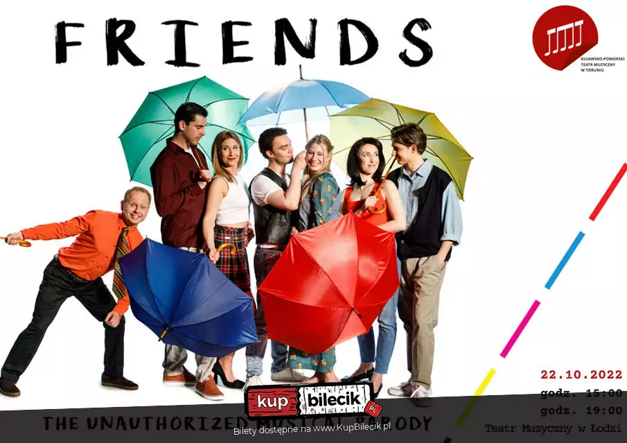 Parodia kultowego amerykańskiego sitcom "Friends" to muzyczna podróż do Nowego Jorku z bohaterami znanymi na całym świecie. Idealna propozycja dla fanów serialu i nie tylko, którzy na scenie znów zobaczą wszystkich głównych bohaterów, w tym niezapomnianego baristę Gunthera czy Janice - nowojorczankę z krwi i kości. To bezpieczny, radosny świat, w którym problemy zawsze rozwiązują się z korzyścią dla bohaterów i nigdy nie dzieją się życiowe tragedie.