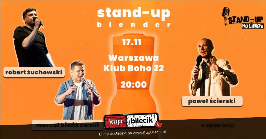 Stand-up Blender czyli komediowa mieszanka stylów już 17.11 zawita do Centralnej Spółdzielni Komediowej w Klubie Boho 22 w Warszawie. Trzech młodych i nietuzinkowych komików podzieli się z Wami swoimi spostrzeżeniami - rzecz w tym, że każdy jest zupełnie inny. Zabierzcie znajomych i wpadajcie na półtorej godziny ostrego śmiechu, rozkmin i niepowtarzalnych przemyśleń, których nie zobaczycie nigdzie indziej.