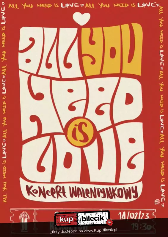 W coroczne święto zakochanych zagramy dla Was miłosne rockowe hity wszech czasów. Ze sceny w Sali Gotyckiej popłyną: "Everybody needs somebody", "I love you baby", "Could you be loved", tytułowe "All You Need Is Love", a także "Kocham Cię kochanie moje", "Zawsze tam gdzie Ty", "Kryzysowa narzeczona", "Całuj mnie", "Bo jo Cie kochom!" i wiele innych znanych piosenek do wspólnego śpiewania i sentymentalnych wspomnień. Bilet na to wydarzenie to walentynkowy prezent na 100% trafiony!