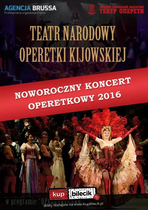 W grudniu 2009 roku TEATR NARODOWY OPERETKI KIJOWSKIEJ obchodził swoje 75 urodziny i otrzymał status Opery Narodowej. Na scenie Operetki Kijowskiej z powodzeniem wystawiane są klasyczne operetki, musicale współczesne i klasyczne, różne programy koncertowe (pokazy, koncerty, orkiestra symfoniczna, opera i balet) oraz wdrażanych jest wiele eksperymentów twórczych. Nowoczesny okres teatru jest bardzo ciekawy i bogaty, utalentowani aktorzy dają publiczności uczucie prawdziwych uniesień. Wielofunkcyjny teatr muzyczny z jasno określoną strategią rozwoju, przejmuje różnorodność stylów i kierunków, zaprasza artystów z innych teatrów i innych krajów i jest w ciągłym poszukiwaniu nowych kreatywny pomysłów. PROGRAM KONCERTU: I część 1) Johann Strauss "Baron cygański" Uwertura - orkiestra 2) Johann Strauss "Zemsta nietoperza" akt II Toast Orłowskiego 3) Johann Straussa "Zemsta nietoperza" akt II Duet z zegarkiem Rosalindy i Eisensteina 4) Emerich Kalmann Księżniczka Czardasza 5) Franciszek Lehar "Kraina uśmiechu" - akt II - "Twoim jest serce me" 6) Franciszek Lehar "Cygańska miłość" akt II czardasz Ilony "Kiedy skrzypki grają" 7) Franciszek Lehar "Frasquita" Serenada Armana 8) Emerich Kalmann "Hrabina Marica" - czardasz balet 9) Franciszek Lehar "Paganini" Pieśń Anny Lizy - akt I "Serce drży , ogień płonie w mojej krwi" 10) Johann Strauss "Baron cygański" akt I "Wielka sława to żart " 11) Taniec cygański Balet 12) Franciszek Lehar "Wesoła wdówka" akt III "Usta Milczą dusza śpiewa" 13) Giacomo Puccini "Cyganeria" Walc Musetty 14) Emerich Kalmann "Księżniczka Cyrkówka" - "Te cudne oczy" 15) Franciszek Lehar "Giuditta" - "Kto me usta całuje ten śni " 16) Emerich Kalmann " Księżniczka Czardasza" duet Sylwii i Edwina 17) Jacquess Offenbach "Orfeusz w piekle" Kankan - balet przerwa 15 minut II część 1) Vittorio Monti "Czardasz" Balet 2) "Czarne brwi" ukraińska pieśń narodowa 3) Robert Stolz "Brunetki -blondynki" z repertuaru Jana Kiepury 4) Gioacchino Rossini ,,Cyrulik sewilski" Aria Figara 5) Charles Gounod ,,Romeo i Julia" Walc Julii 6) Pablo Sorozabl, Romanza de Leandro zarzuela 7) Louis Prima Sing, sing, sing Balet 8) Riccardo Cocciante Le Cathedrales z musicalu ,,Dzwonnik z Notre Dame,, 9) Rodolfo Falvo ,,Dicitencello vuie,, włoska pieśń 10) Fredrik Kempe "La voix" 11) Josh Groban "Per te" 12) Francesco Sartori "Con Te Partiro" "Time to Say Goodbye" 13) Giuseppe Verdi "Brindisi" La traviata