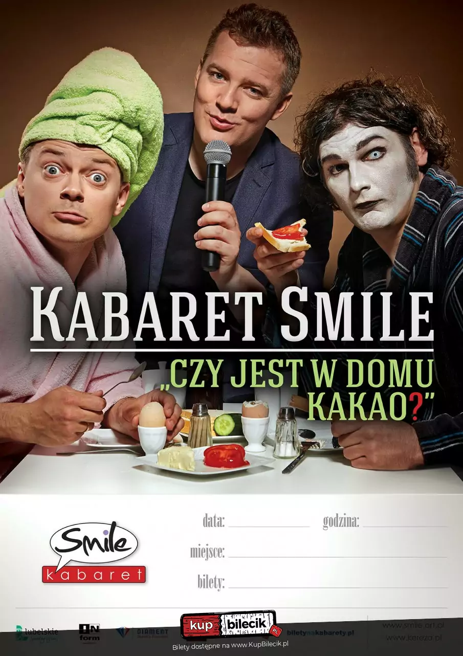Przedstawiamy Państwu Kabaret SMILE, który podbojem zdobywa publiczność wszędzie gdzie się pojawi. Prezentowane w skecze i piosenki, nawiązują do otaczającej nas rzeczywistości pozwalając spojrzeć widzowi na groteskowość zarówno codziennych, wydawałoby się mało śmiesznych sytuacji jak i tych występujących w nietypowych, często dziwnych okolicznościach. SMILE jest wielokrotnym finalistą przeglądu kabaretowego PAKA. W 2009 roku na prestiżowym festiwalu "Ryjek" zajął 3 miejsce a w roku 2011 został zwycięzcą tego festiwalu. W 2010 na festiwalu "Debeściak" zdobył I miejsce (przyznawane przez publiczność). Podczas występu tych trzech, przesympatycznych panów z Lublina, widzowie nie tylko zapominają o wszechobecnej polityce, ale również są częstowani błyskotliwymi skeczami a następnie upajają się łatwo wpadającymi w ucho, zabawnymi piosenkami - jednym słowem (ewentualnie dwoma) - kabaretowa uczta.
