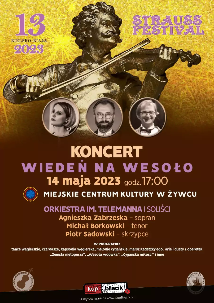 W programie : Tańce węgierskie, czardasze, Rapsodia węgierska, melodie cygańskie, Radetzky - Marsz, Arie i duety z operetki "Zemsta nietoperza"Wesoła wdówka" Franz Lehar - Arie i duety z operetki "Cygańska miłość", "Wesoła wdówka" i inne. Kontynuacja cyklu koncertów Strauss Festival z repertuarem związanym z Wiedniem i Budapesztem. Orkiestra prezentuje swoje muzyczne podróże w Teatrze Polskim w Bielsku-Białej od 1994r w cyklu" "Muzyka dawna i muzy" , "Walce Straussa na wesoło" i "Koncerty Noworoczne".