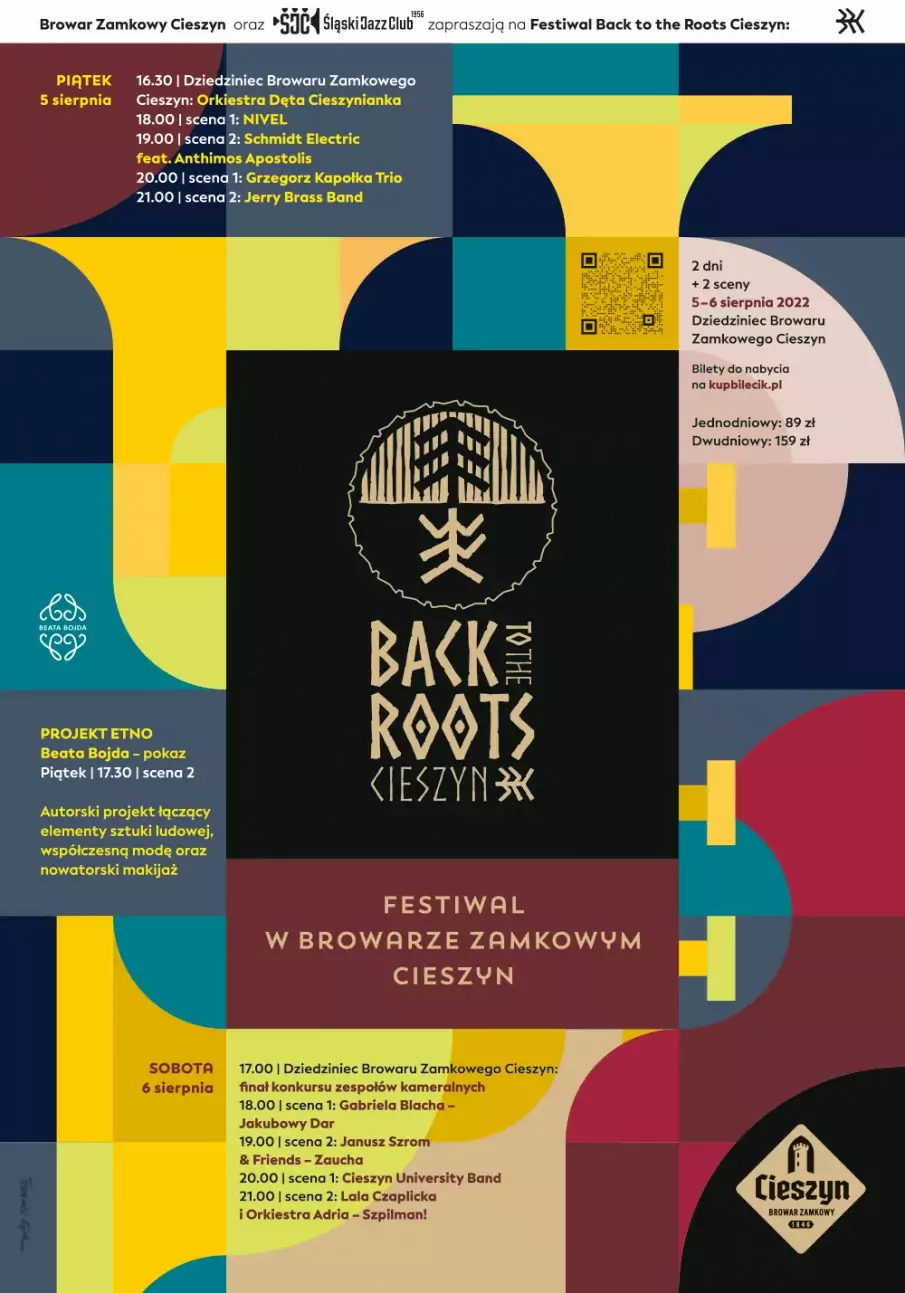 Back To The Roots - pierwsza edycja wyjątkowego festiwalu jazzowo-bluesowego. Wystąpią: Jerry Brass Band, Grzegorz Kapołka TRIO, Schmidt Electric feat. Anthimos Apostolis, Nivel, Lala Czaplicka i Orkiestra Adria - Szpilman, Bartek Jaśkowski i School Band, Janusz Szrom & Friends - Zaucha, Gabriela Blacha i Radosław Pendziałek - Jakubowy Dar.